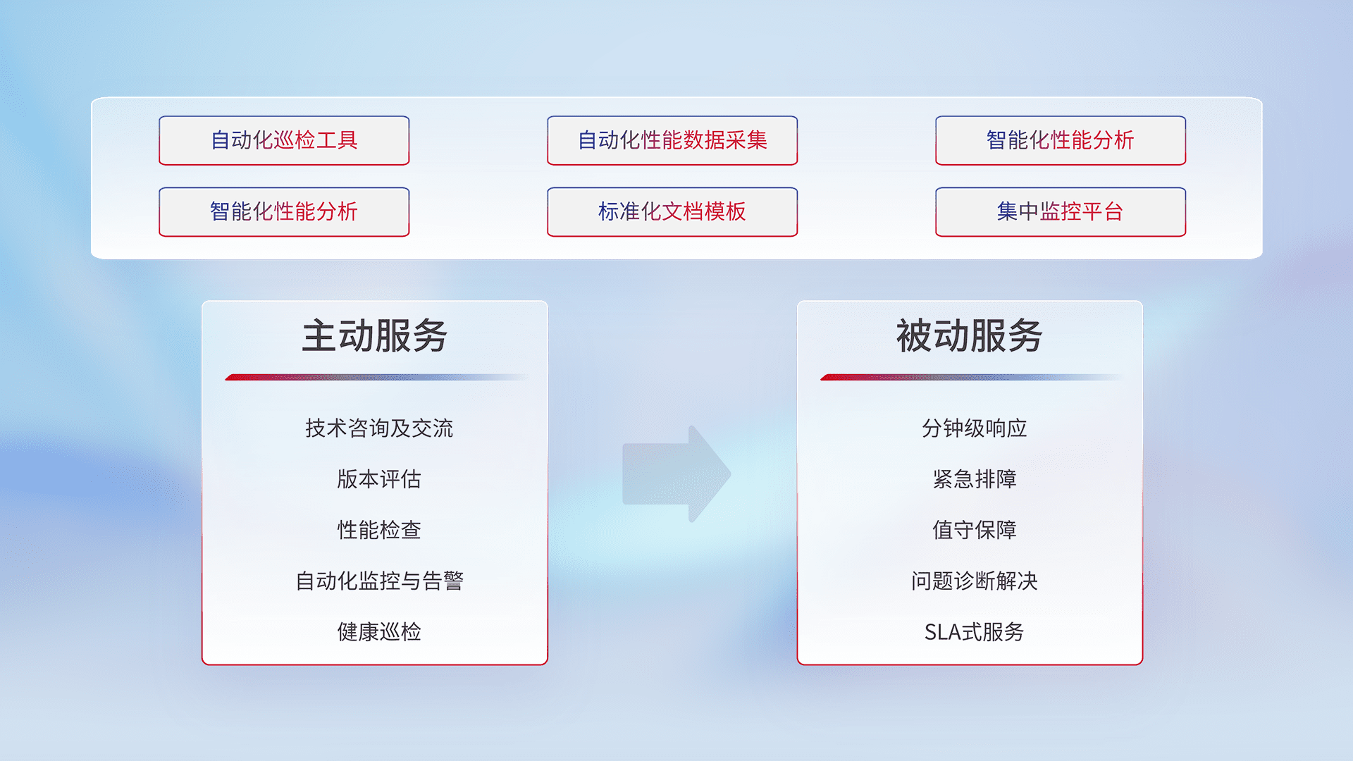 智能化工具和标准化文档,,,保障服务质量,,,,提供主动服务(包含技术咨询、、版本评估、、、、性能检查、、、、自动化监控与告警、、、健康巡检)和被动服务包含(分钟级响应、、、、紧急排障、、值守保障、、、问题诊断解决、、、SLA服务)。。。。