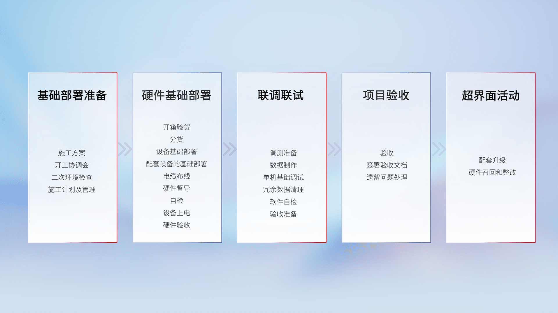 从基础部署准备、、、硬件基础部署、、联调联试、、项目验收、、、越界面活动的全过程可追溯,,,保证施工质量和进度。。。。